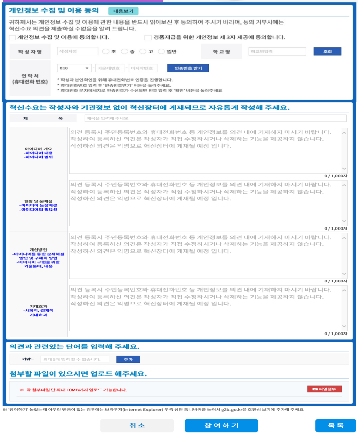 - 공모방법: 혁신장터 홈페이지(ppi.g2b.go.kr) → 혁신수요 아이디어 배너 클릭