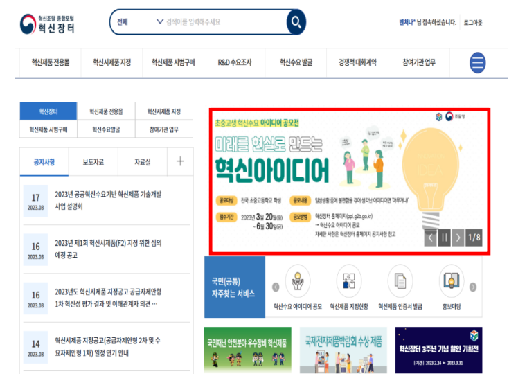 혁신장터 홈페이지에 접속하여 초중고생 혁신수요 아이디어 공모전 배너 클릭 후 접속합니다.