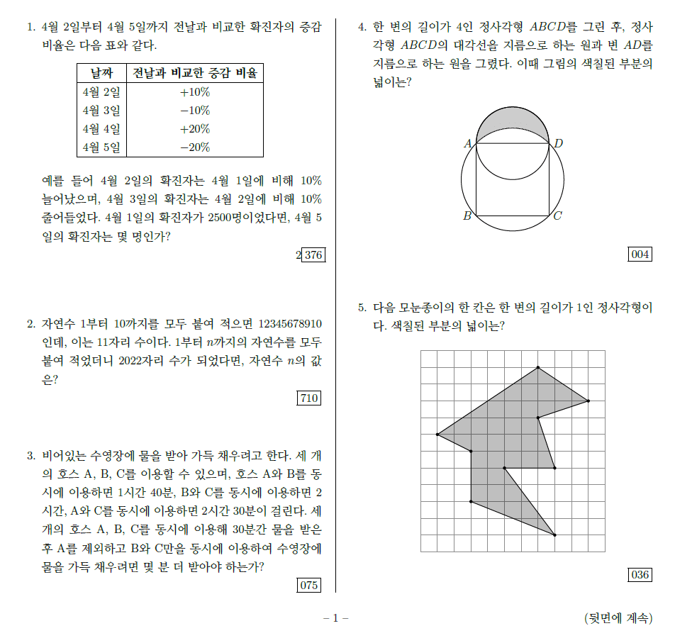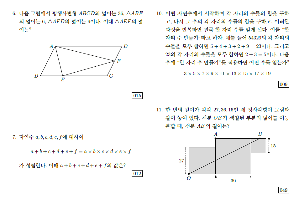 3. 출제범위 : 초등학교 전 과정과 중학교 1학년 1학기 교육과정에서 학습한 내용을 활용하여 풀이할 수 있는 수학 문제
