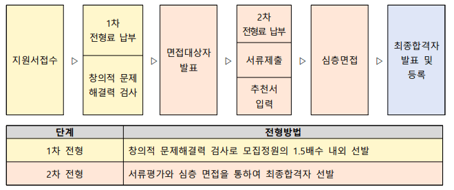 전형과정은 지원서를 접수하고 1차 전형료를 납부합니다. 그리고 창의적 문제해결력 검사를 실시한 후, 면접대상자를 발표합니다. 면접대상자에 선발된 학생들은 2차 전형료를 납부하고 서류와 추천서를 제출합니다. 이후 심층면접이 진행되며 최종합격자 발표 후 등록하면 됩니다.