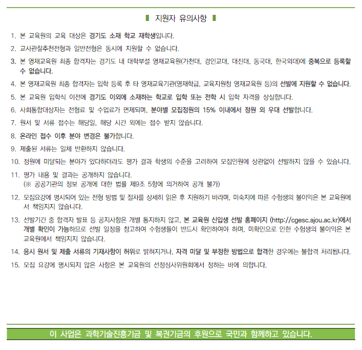 아주대학교 과학영재교육원 신입생 선발 홈페이지 http://cgesc.ajou.ac.kr | |
