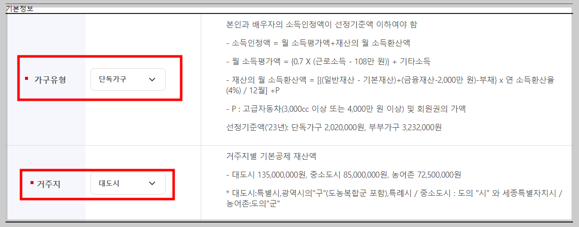 가구에 따라 선정기준액은 단독가구 2,020,000원, 부부가구 3,232,000원에 해당되며