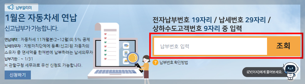나의 자동차세는 간단한 개인정보 인증으로 조회할 수 있으며 조회 후 즉시 납부도 가능합니다.