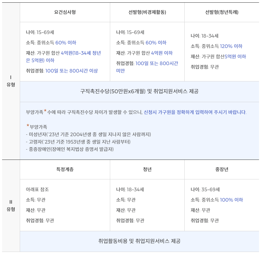유형에 따라 구직촉진수당과 취업지원서비스, 취업활동비용과 취업지원서비스를 제공받을 수 있습니다.