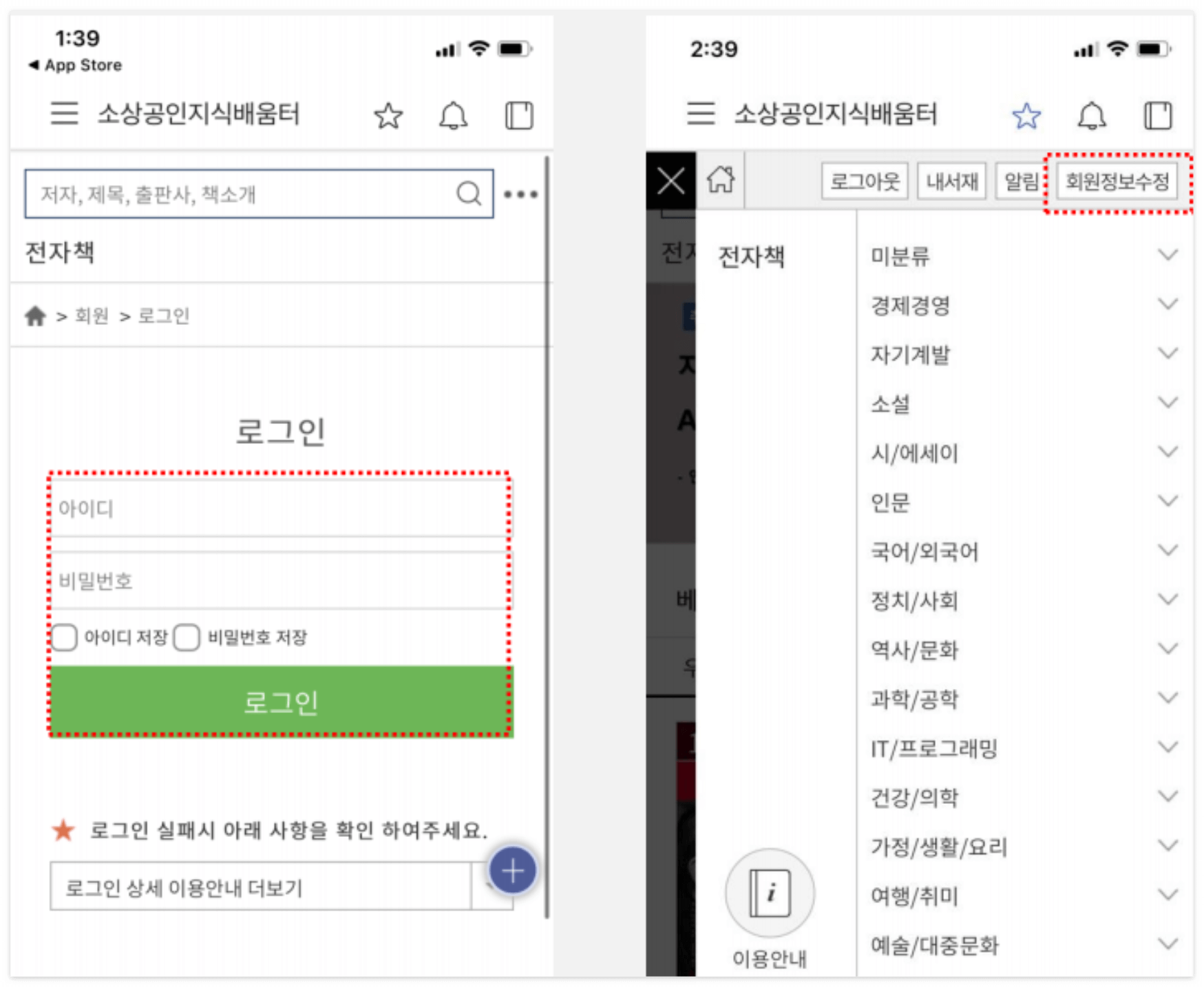 모바일 최초 로그인 시 아이디와 비번은 PC에서 가입하신 지식배움터 아이디와 동일합니다.