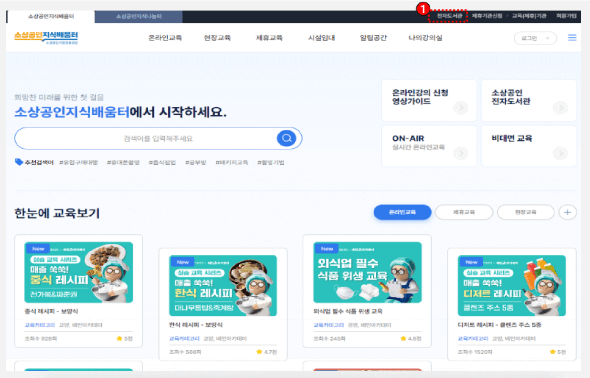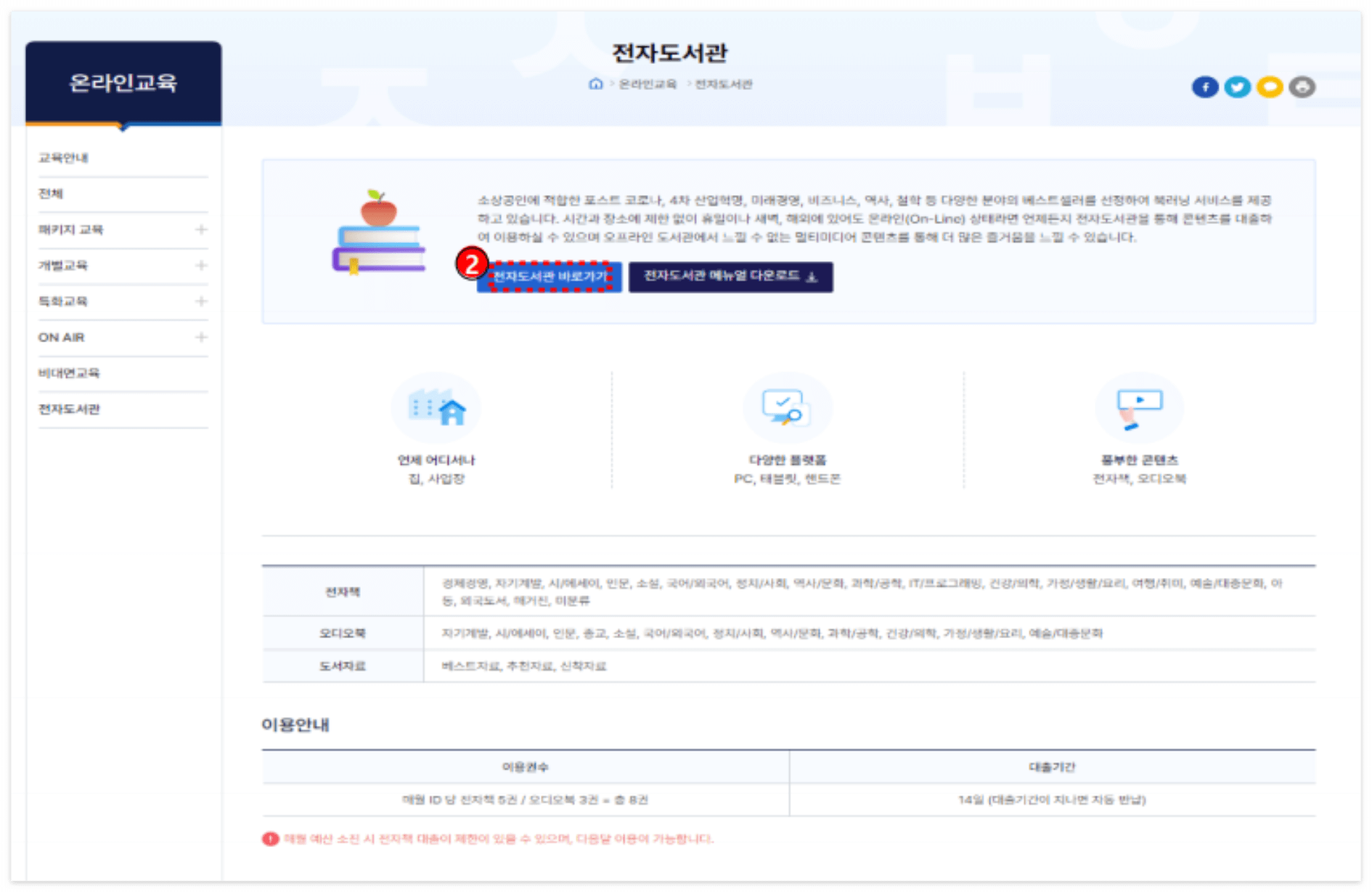 정부에서 운영하고 관리하는 소상공인지식배움터에서는 무료 전자도서관을 이용할 수 있습니다.