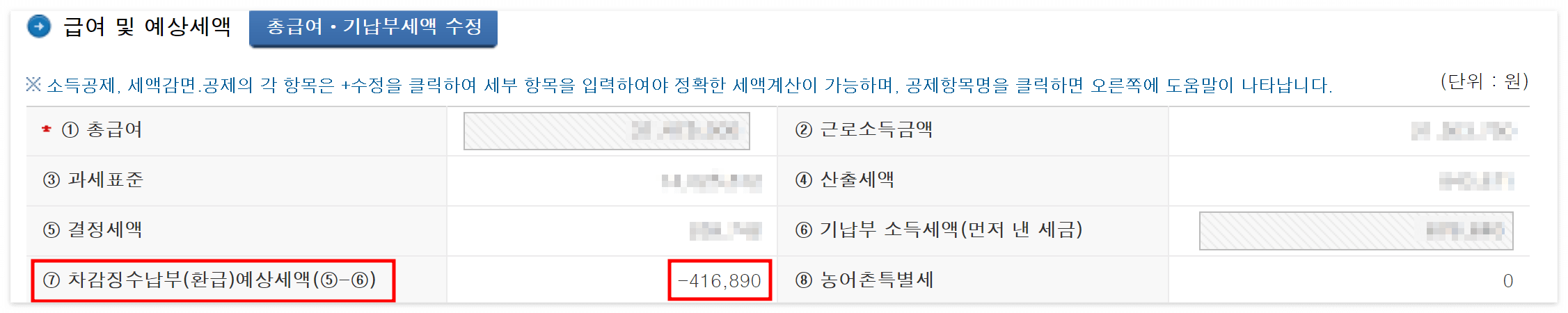 자동으로 입력이 되는 급여 및 예상세액으로 환급 예상세액을 확인할 수 있습니다.