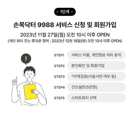 서울시는 시민 모두가 99세까지 88하게 산다는 의미로 손목닥터9988 헬스케어 사업을 시행합니다.