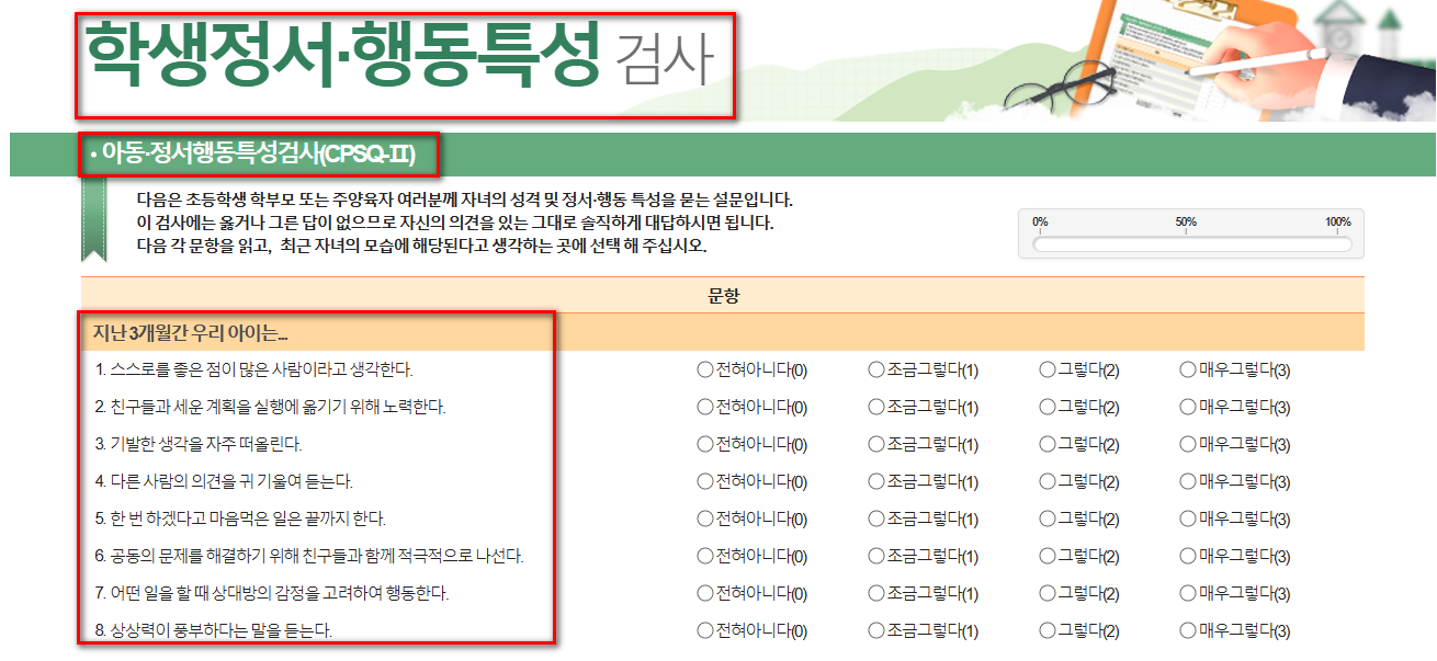 검사 결과에 따라 적절한 시기에 아이의 정서·행동특성이나 스테레스 대처 방법을 정신건강전문과와 의논하는 일은 내 아이가 건강하게 성장발달을 하는 데 많은 도움을 주게 될 것입니다. 그러므로 우리 아이들을 사랑하는 부모님들은 꼭 학생정서·행동특성검사에 참여해야 합니다.