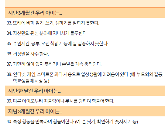 - 자녀 또는 본인에게 전혀 해당되지 않는 경우는 전혀아니다(0점)