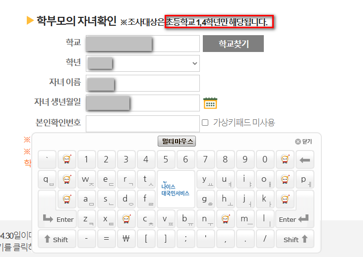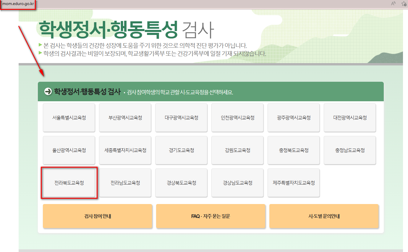 인터넷 주소창에 주소를 입력하고 학교 소속 관할 교육청을 선택합니다. 그리고 초등학교 1학년과 4학년 학부모는 학부모 참여하기 버튼을 누릅니다. 그리고 참여 전 설명 동영상도 시청하면 도움이 됩니다. 그리고 자녀 정보를 확인하여 입력하고 아이가 학교에서 받아온 가정통신문의 학생정서·행동특성검사 발송용 주소(영문과 숫자가 섞인 암호)를 입력하고 검사에 참여합니다. 검사 결과 후 제출하고 검사를 종료하면 됩니다. 도중 멈출경우 임시저장을 눌러야 합니다. 그래야 저장이 되고 검사 도중 오류 발생할 경우 재 로그인 후 임시저장한 그 탭부터 다시 작성하면 됩니다.