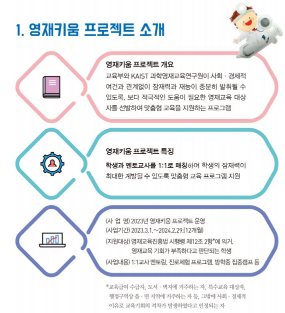 교육부와 KAIST 과학영재교육연구원이 사회·경제적 여건과 관계없이 잠재력과 재능이 충분히 발휘될 수 있도록 보다 적극적인 도움이 필요한 영재교육 대상자를 선발하여 맞춤형 교육을 지원하는 프로그램입니다. 환경에 상관없이 도움이 필요한 영재교육 대상자를 선발하여 맞춤형 교육 프로그램을 지원하는 프로젝트입니다. 영재키움 프로젝트의 특징은 학생과 멘토교사를 1:1로 매칭하여 학생의 잠재력이 최대한 계발될 수 있도록 맞춤형 교육 프로그램을 지원하는 프로그램입니다.